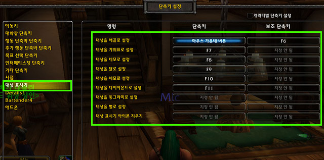 가운데 버튼(휠)을 누르는 곳에 "해골징표"가 가장 이상적입니다. 전투시에도 즉시 대상을 점사할 수 있기 때문이죠. |