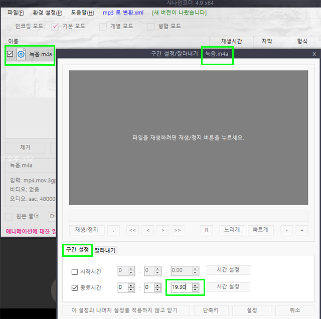 m4a 파일을 mp3로 변환시킴과 동시에 녹음시간 짜르기를 위한